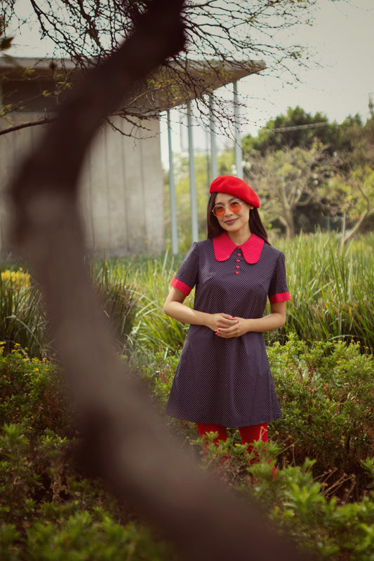 Collared Mini Dress in Blue and Red Dots