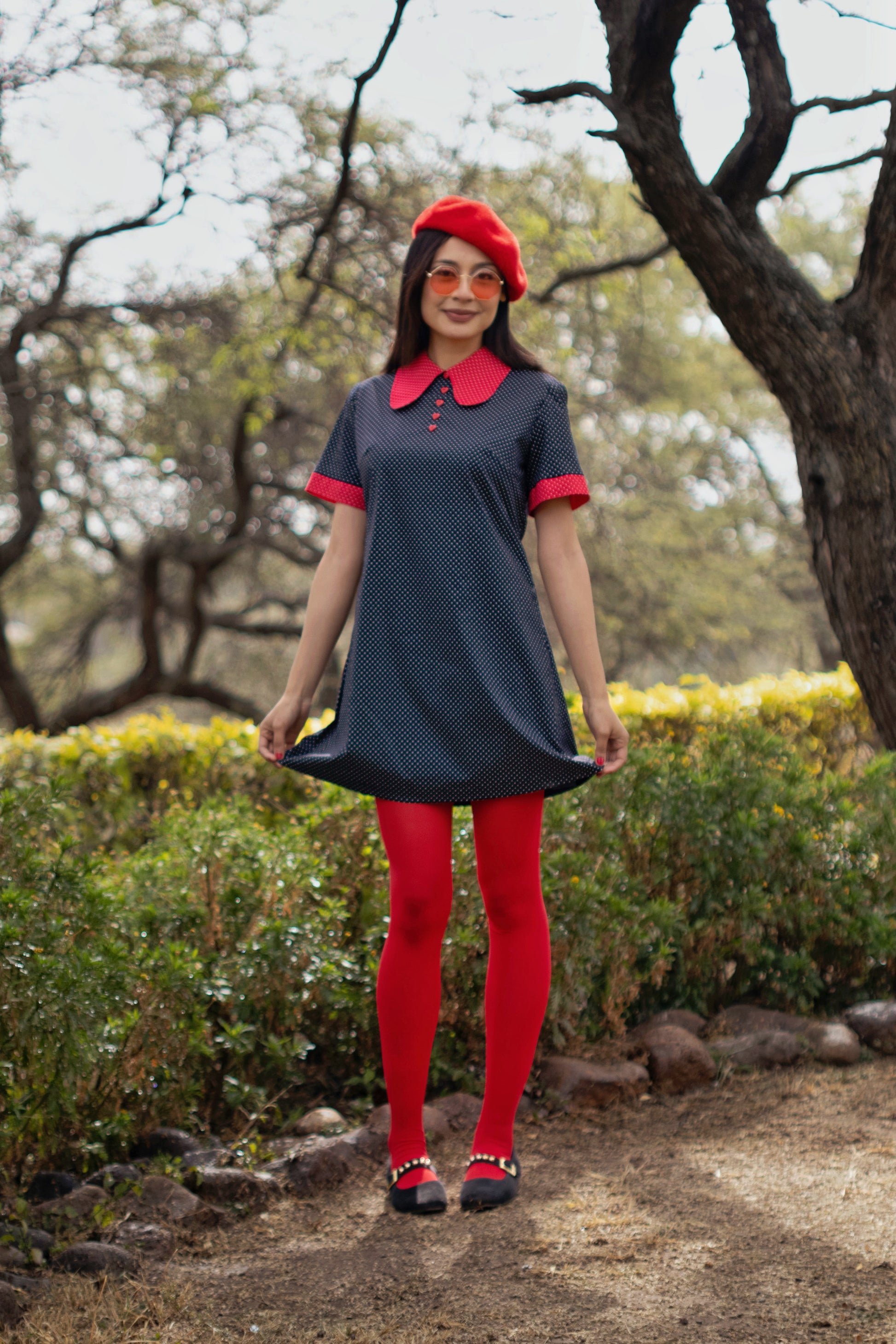 ✿ Mini vestido de algodón estampado pin dots en azul y rojo